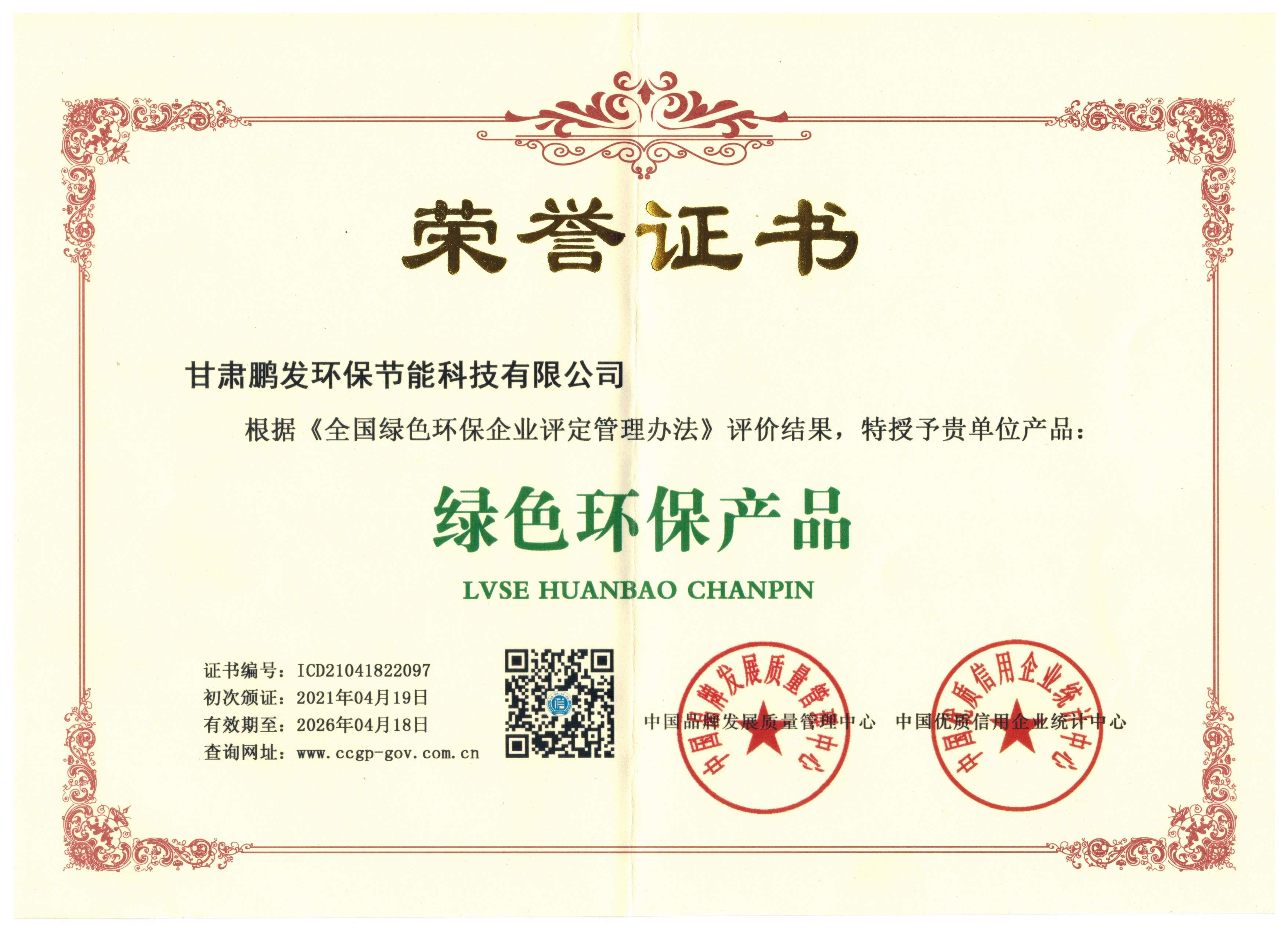綠色環(huán)保產(chǎn)品榮譽證書