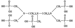 別名:二己烯三胺五亞甲基膦酸 分子式:C17H44O15N3P5 相對分子質(zhì)量:685 結構式: 一、性能與用途 BHMTPMPA是高效的螯合型阻垢劑,對碳酸鹽垢和硫酸鹽垢具有良好的阻垢效果。BHMTPMPA在較寬的pH范圍和120°C高溫下有極佳的水溶性和熱穩(wěn)定性,對鈣離子容忍度高。BHMTPMPA用作油田水處理的緩蝕阻垢劑,工業(yè)循環(huán)冷卻水和鍋爐水的阻垢緩蝕劑。 二、技術指標